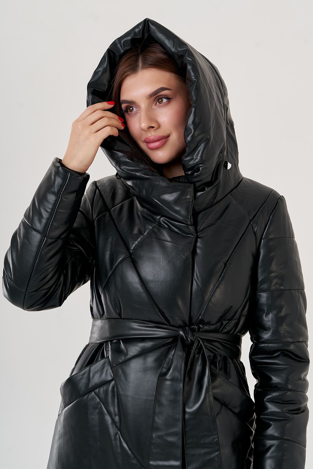 Пуховое пальто из эко кожи будет радовать вас осенью и зимой. Изделие из водонепроницаемого материала. Утеплитель - верблюжья шерсть. Объемный капюшон заменит шапку и укроет от ветра. Застегивается на молнию и кнопки, также есть пояс.