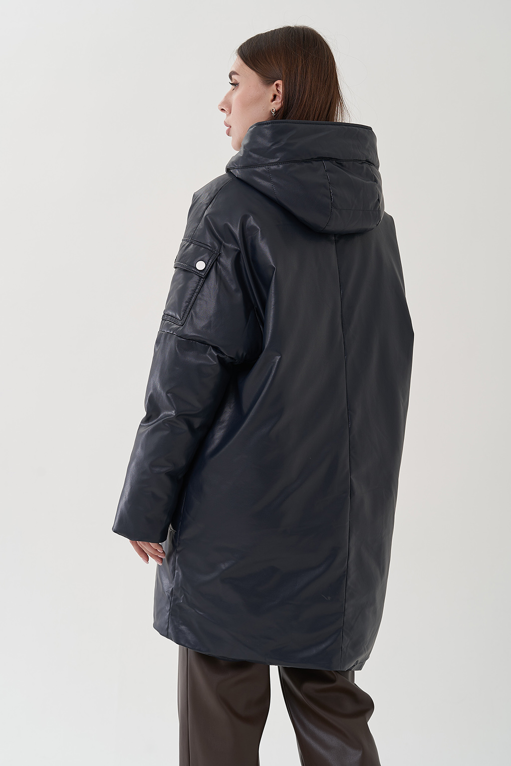 Женский пуховик из эко кожи коричневого цвета